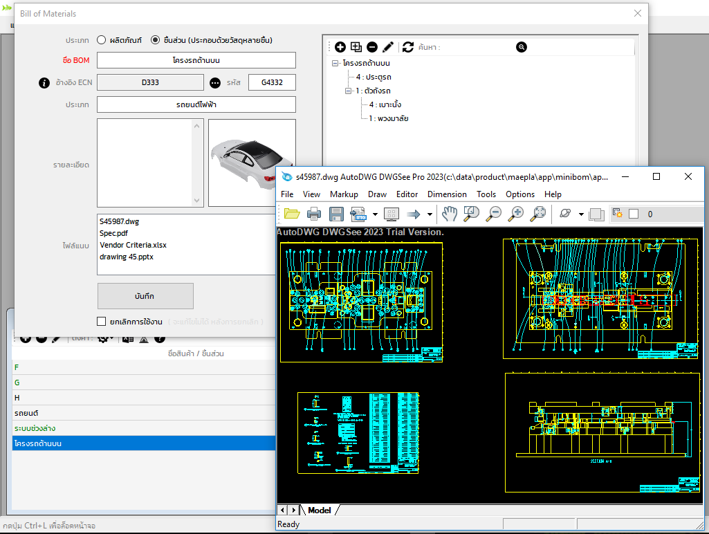 ทั้ง 3 ระบบทำงานเชื่อมโยงกัน และสามารถแนบไฟล์ drawing / spec / อื่นๆ ในแต่ละ item ของ BOM, ECR และ ECN ได้, สามารถแก้ไขไฟล์แนบต่างๆ จากระบบ miniBOM ได้โดยตรง สามารถตรวจสอบ log ได้ว่าใครเอาแนบไฟล์เข้า, ลบไฟล์แนบออก, เปิดไฟล์แนบเพื่อแก้ไขเมื่อไหร่ (1 เครื่องสามารถล็อกอินได้หลาย user) ระบบออกแบบมาจัดการเรื่อง consistency ของไฟล์แนบได้ดีขึ้น คือลดการสับสนว่าไฟล์ข้อมูลเดียวกันแต่เก็บหลายที่ เมื่อข้อมูลเปลี่ยน จะมีการเปลี่ยนครบทุกไฟล์หรือไม่